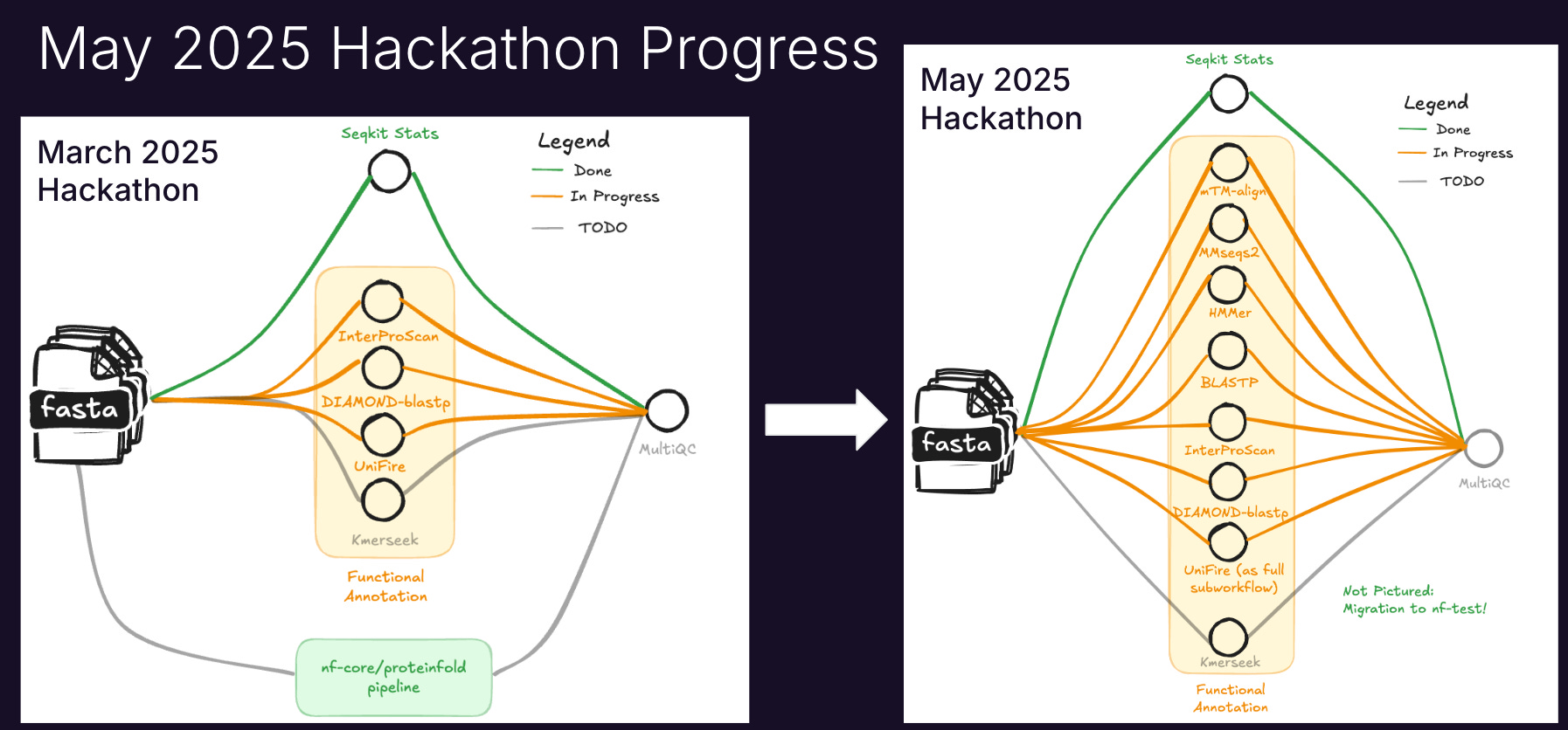 Being part of the nf-core community is key to Seanome’s success because we want to engage with the global community of tool and pipeline builders. We are developing our own tool for annotating unknown proteins (Kmerseek) but to do that, we need to (1) benchmark it against the competition to demonstrate Kmerseek can find things other tools can’t and (2) empower OTHERS to use it as easily as possible! Hence, we are building nf-core/proteinannotator, a unified Nextflow pipeline to characterize “mystery” proteins, aka proteins of unknown function from their sequence data.
